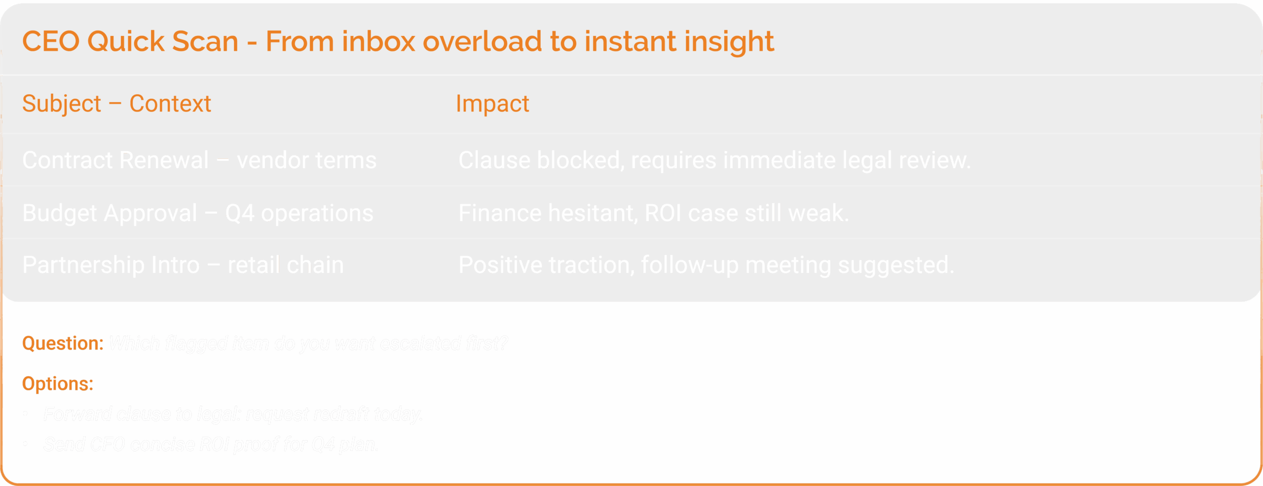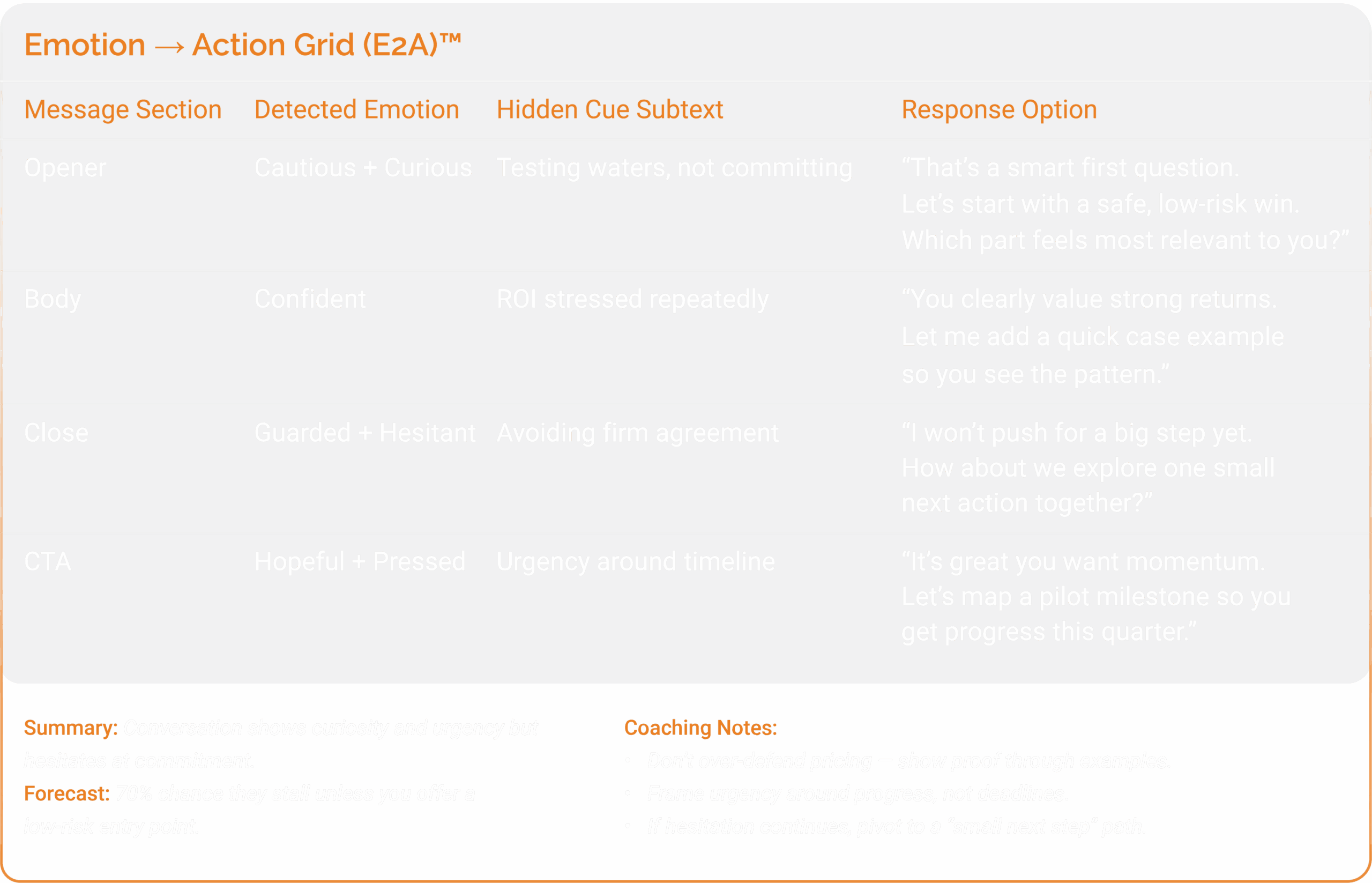 In business, every word is a decision driver. XFactorAi™ transforms everyday communication into a strategic advantage with real-time scoring, laser-focused metric grids, executive-ready summaries, sentiment-to-action mapping, hidden agenda detection, and sales-stage alignment. From inbox to impact, you’ll know exactly what to say, how to say it, and why it will work.