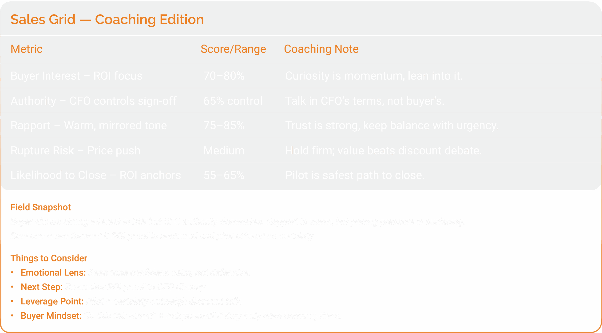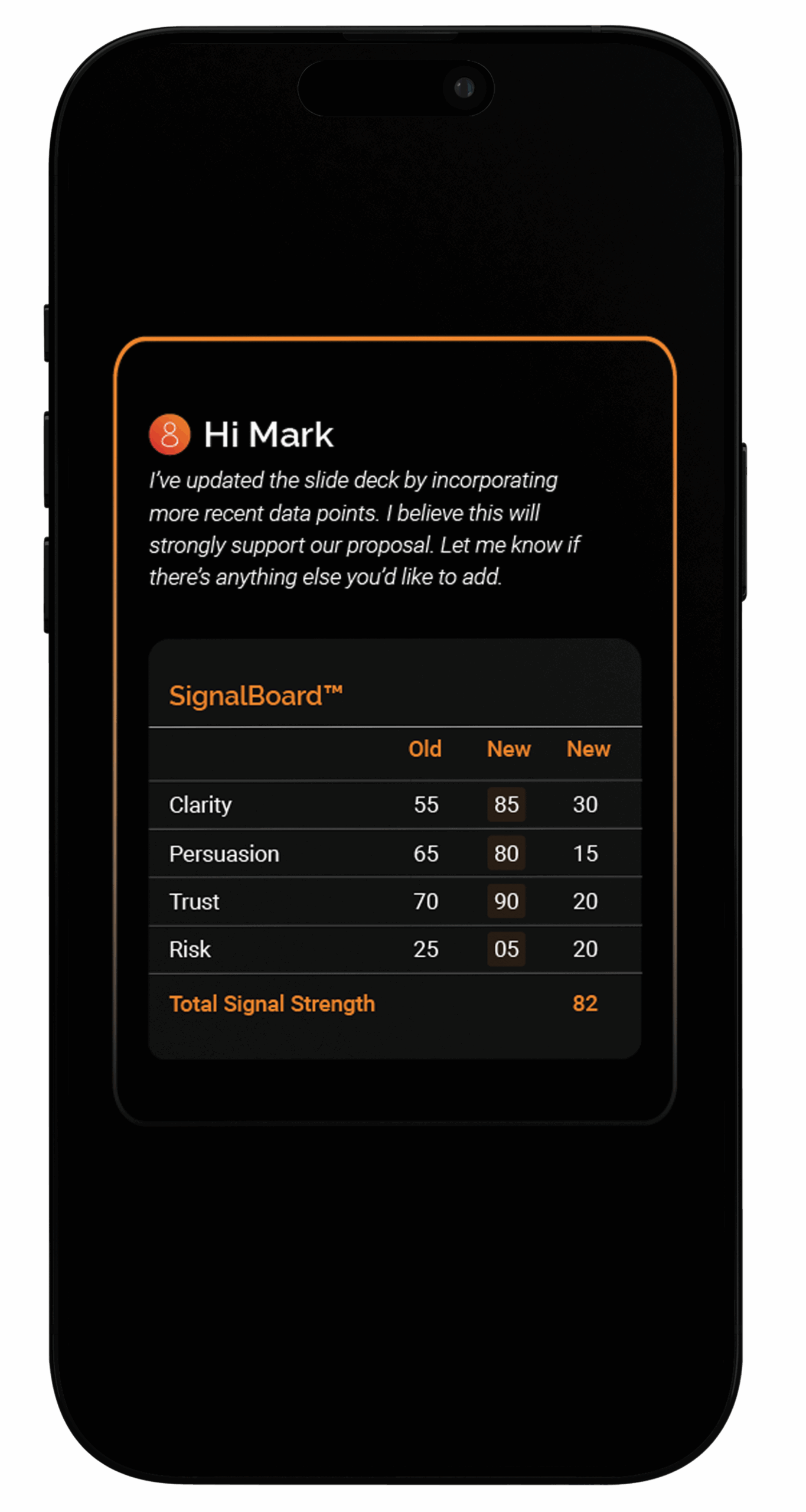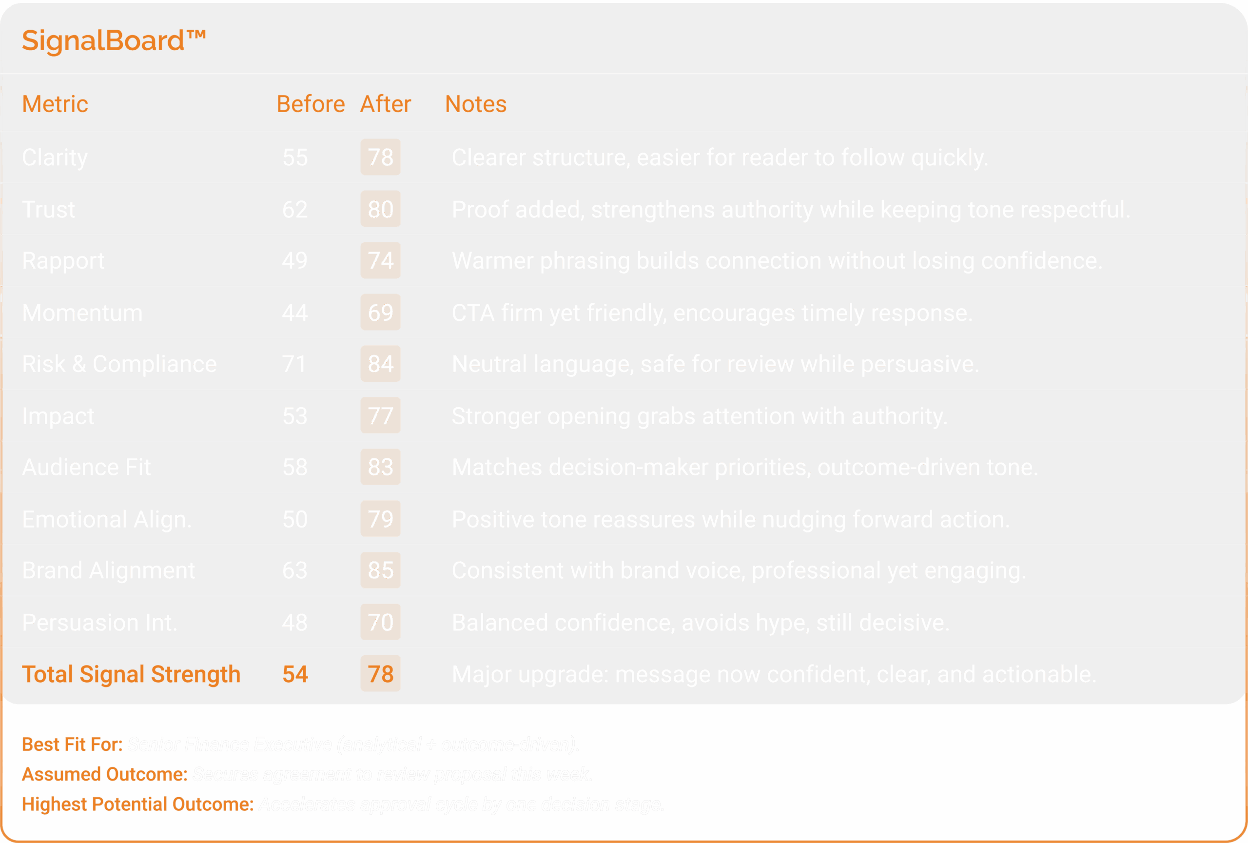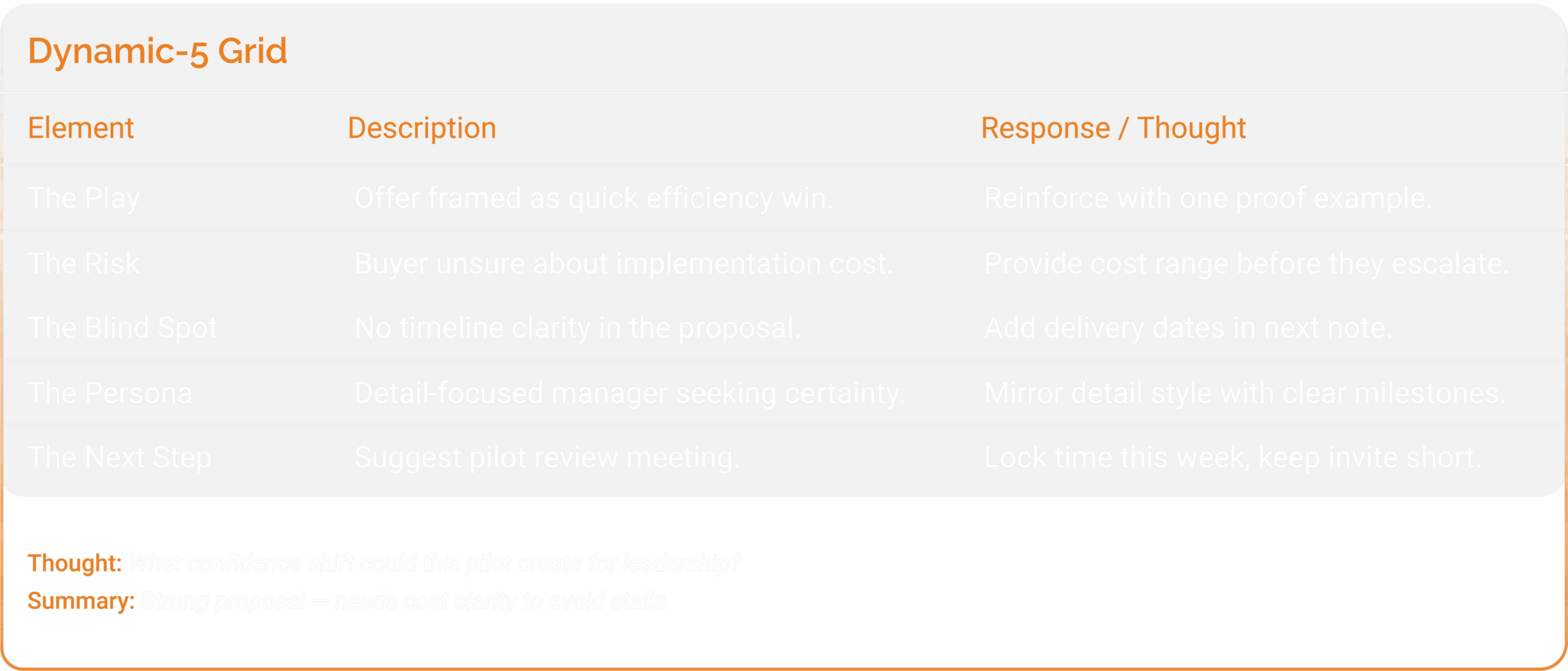 The Dynamic‑5 Grid distills your full analysis into the five most relevant metrics for your declared goal — whether that’s winning approval, closing a deal, or reducing risk. It’s a laser‑focused view that shows concise, actionable notes so you can improve in minutes, not hours.